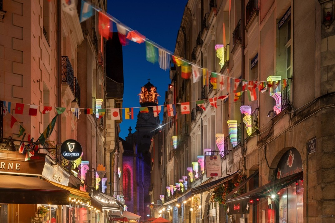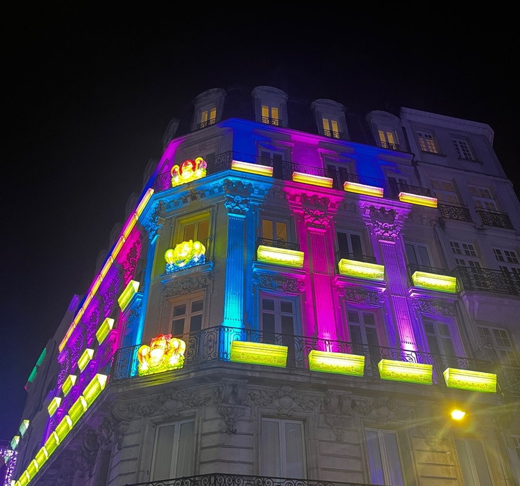 The first main animation of Le Voyage en Hiver is the “La nuit je vois” (At night I see) exhibition. Created in 2022 by the artist Vincent Olinet and renewed every year; “La nuit je vois” is a light decorations itinerary running through the streets of the city. This exhibition is made of hundreds of lanterns and luminous statues, creating a magic, shining and colourful panorama of Nantes. You can see a harmony of cyan, yellow, and magenta colours during this period of the year. For the artist, “La nuit je vois” is a luminous portrait of Nantes. In fact, to create these lanterns and these sculptures, Vincent Olinet took inspiration from architectural and design elements of the city, like mouldings, brackets, or mascarons. This itinerary grows year by year and this winter, Vincent Olinet enlightened 66 streets with his decorations. Hence, this year, the artist added 185 “gates” that are currently decorating a lot of buildings fronts. For the aesthetic of these gates, he took inspiration from classical brackets, which are the pillars that sustain old balconies. The idea is to make the buildings look as if they wanted to hold each other’s, by creating them some sorts of arms. Some of the “La nuit je vois” sculptures have become iconic through these four years and keep being installed for every edition of Le Voyage en Hiver. In fact, the most known sculpture of this exhibition is the big deer lantern, which also became the symbol of Le Voyage en Hiver. This is why Vincent Olinet hopes that this exhibition could become a new tradition. He said in an interview that maybe for some children, this exhibition will be impactful and that maybe someday, when they will be older, Christmas will remind them of “La nuit je vois”.